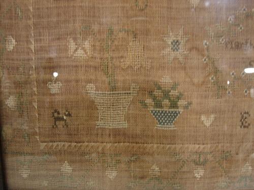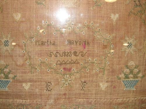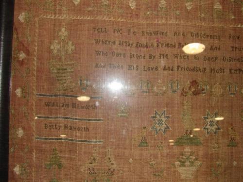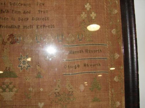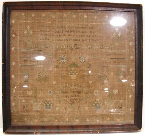 1822 FRAMED NEEDLEPOINT SAMPLER. By Martha Haworth. Depicts text at top with names of relatives at sides. Decorated with birds, trees, flowers, and dogs. Shows signs of fading and some wear to fabric. Frame shows some loss to wood. 18.75” x 20.25” framed.