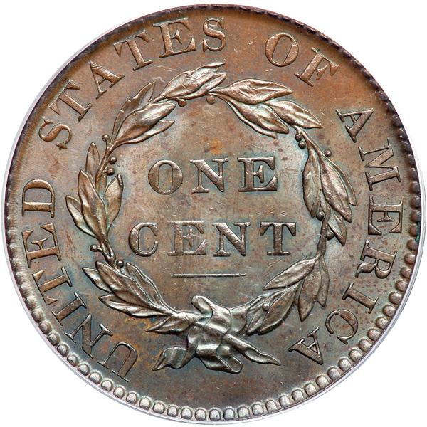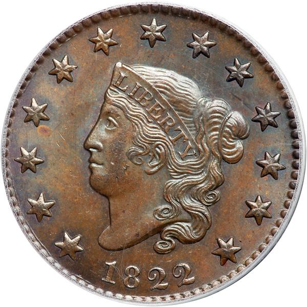 1822 N-10 R2. PCGS graded MS-64 Brown. Lustrous light chocolate brown with overtones of light bluish steel. A small spot of lighter brown toning close under star 4 and a few microscopic ticks on the cheek and in the field right of star 3 are the only marks. Nicely struck MDS with radial lines in most of the stars and the remaining details fully impressed. Portions of the inner circle remain visible at the tips of the obverse dentils and the rim is starting to dish at the top of the reverse. Called MS63 choice and tied for CC#1 in the Noyes census, his photo #35415. Bland says MS60+ and tied for CC#2. Our grade is MS63. Pop 2; Only 3 graded at PCGS for the variety. DWH #3535 (PCGS # 36739) .