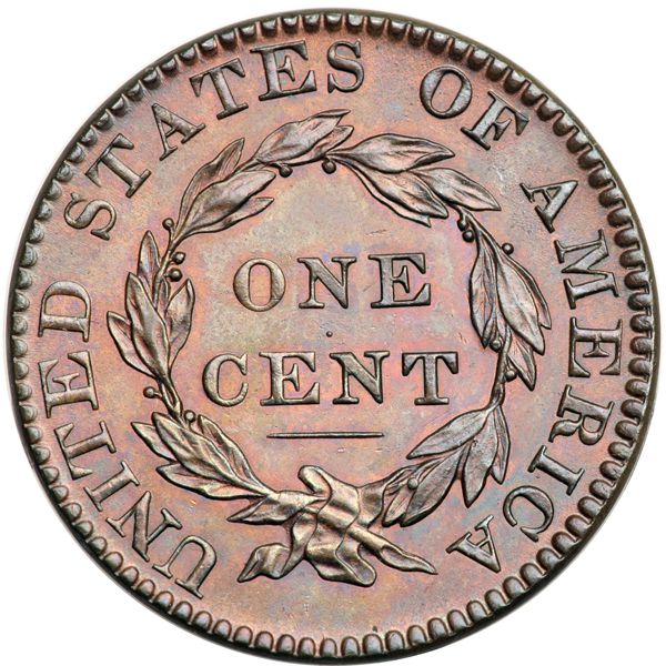 1822 N-11 R2 MS64. Frosty reddish steel brown faded down from mint color with overtones of bluish steel. Ample faded mint color remains in the protected areas on both sides and the eye appeal of this piece is outstanding. The only marks are a faint spot of darker toning at the peak of the 1 in the date and a pair of tiny nick-like planchet voids on the cheek right of the nostril. Early die state. The strike is needle sharp except for the radial lines in some of the lower stars. Called MS65+ and finest known in the Bland census. Noyes says MS63 and CC#1, his photo #21514. Removed from a PCGS slab graded MS64BN (PCGS label included, and it shows the attribution and Naftzger provenance).
