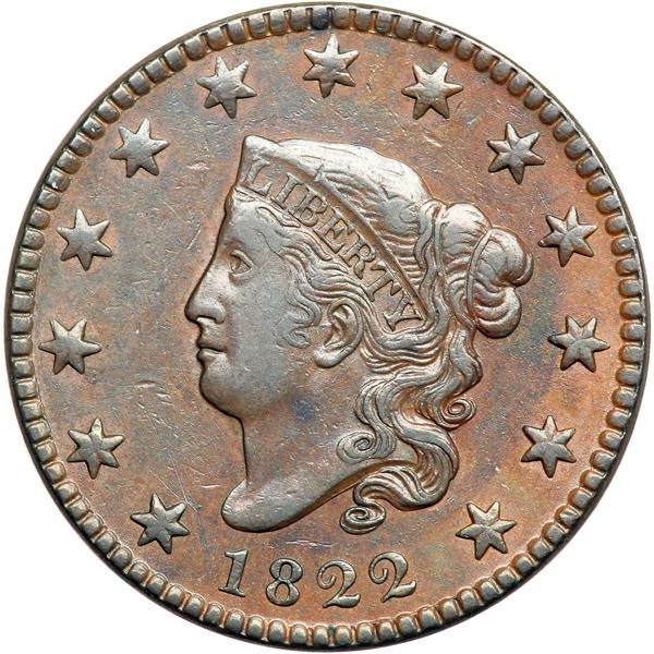 1822 N-13 R5 EF40. Finest Known. EF-40. Very attractive glossy light steel brown and tan with darker steel brown toning on the highpoints and lots of frosty mint luster covering the protected areas on both sides. There are a few very light contact marks, including a pair of very light hairline scratches over star 1 and a tick on the coronet over the B, but none of the marks is distracting and the eye appeal of this cent is very nice. MDS. The fields on both sides are smooth and slightly reflective from a fresh die lapping performed before this brief marriage of two previously-used dies. This was the third example discovered of the die variety, and it is the finest known among the 50 or so examples extant. Called EF40 and finest known in the Noyes census, his photo #26871. Bland says VF35 and CC#1 in his census. Removed from an NGC slab graded AU58BN (NGC label included, and it shows the attribution and Reiver provenance). DWH #2911.