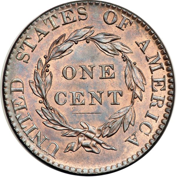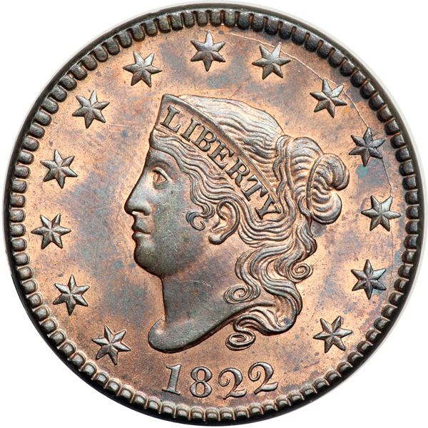 1822 N-2 R3 MS65. Beautiful lustrous mint red and bluish steel brown, nearly half the mint color showing on both sides. A wisp of darker bluish steel toning close under star 10 is the best identifying mark. MDS showing the usual die crack at stars 7-12, but the dentils are strong on both sides and the fine dash at S-O is clear. The dash at D-S is gone. A gem cent offering superb eye appeal. Called MS65+ and CC#1 in the Bland census. Noyes says MS65 choice and CC#1 as well. Removed from a PCGS slab graded MS65RB (PCGS label included, and it shows the attribution and Naftzger provenance).