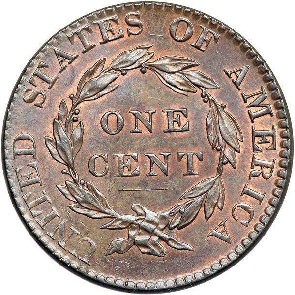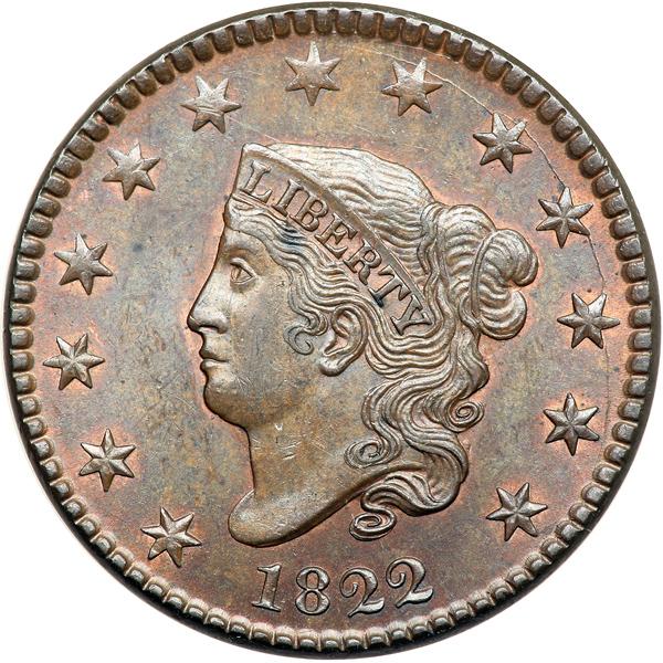 1822 N-2 R3. PCGS graded MS-64 Brown. Lustrous light steel brown with delicate overtones of bluish steel, especially on the obverse, and 5-10% of the original mint color remaining, mostly on the reverse. There is a small spot of darker olive toning in the hair under the B in LIBERTY and some very light contact marks scattered about the obverse. A nick on star 6, a hairline scratch from that star to the hair over the coronet, and a light scratch along the dentil tips over star 8 are good identifying marks. MDS. The die crack through stars 8-11 is clear and the long dash between the bases of second S in STATES and the adjacent O is obvious. The fields are satiny from microscopic radial die flowlines. A cent with excellent eye appeal. Called MS63 and tied for CC#2 honors in the Bland and Noyes census lists, Noyes photo #33218. Our grade is MS60+. Pop 3 none finer in Brown at PCGS for the variety. DWH #2593 (PCGS # 36715) .
