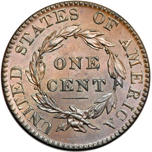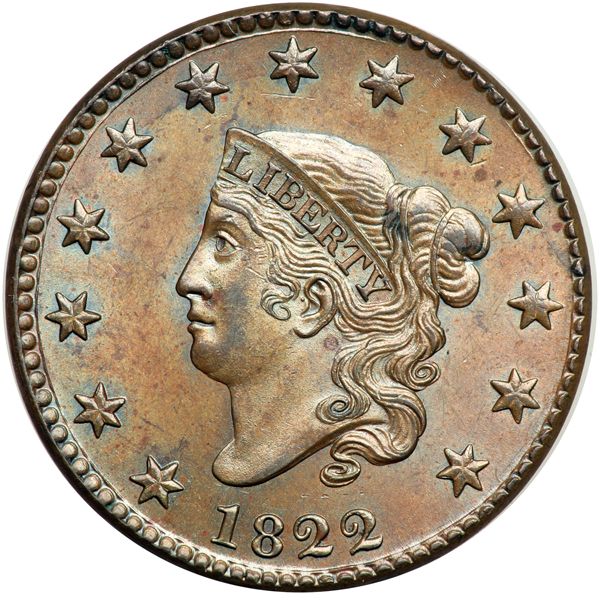 1822 N-4 R2 MS62. Lustrous light steel brown with medium brown toning on the lower part of the reverse and attractive bluish steel overtones in protected areas, especially on the obverse. Excellent eye appeal with only a few tiny marks, including a few tiny ticks at the eye and a small wisp of darker toning hidden in the hair cords over the T in LIBERTY. Sharply struck EDS with doubling on much of the reverse from die bounce. Graded MS61 by Del Bland. Noyes says MS63 and tied for CC#4 in his census, photo #21529. Comes with an impressive provenance. Removed from an old green label PCGS slab graded MS64BN (PCGS label included).