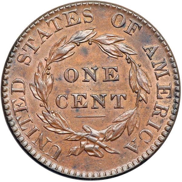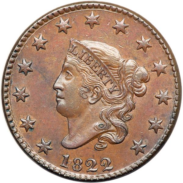 1822 N-4 R2. PCGS graded MS-62 Brown. Glossy light steel brown with hints of very faded mint color in protected areas of the reverse. A small nick right of star 6 and a tiny hairline under star 8 are the notable marks, but they are not significant. MDS. The fields are smooth and reflective from a fresh die lapping that left fine die polishing lines in the field before the neck, and the reverse rim is starting to dish at the top. Called MS60 net AU55 in the Noyes census, his photo #37029. Our grade is AU50. Pop 1; 1 in 63; 2 in 65. Only 4 graded at PCGS for the variety. DWH #0547 (PCGS # 36721) .