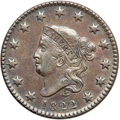 1822 N-5 R3. EF-40 Plus. Very attractive glossy chocolate and steel brown with frosty luster showing through in the protected areas. Very close to EF45. The only mark is a very light rim bruise at CA in AMERICA. LDS with fine die rust showing on the face and neck and the reverse center dot gone. The fields are smooth and slightly reflective thanks to a fresh die lapping.