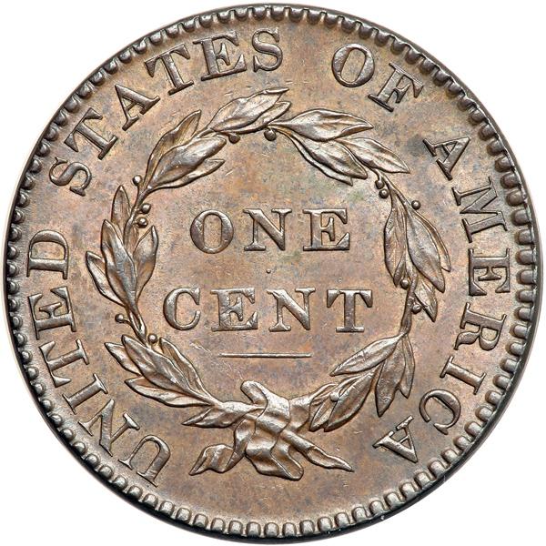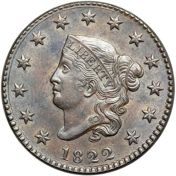 1822 N-6 R3. PCGS graded MS-62 Brown. A sharp, attractive cent with just a hint of light rub on the highest points and a swipe of extremely fine roughness over the E in ONE. Otherwise this cent is choice. Frosty bluish steel brown with lighter brown toning covering most of the reverse. Sharply struck E-MDS. The dentils are sharp around both sides and the partial inner circle on the obverse is clear. The reverse shows extensive doubling from die bounce, with some places showing sharp multiple outlines. Called MS60 and tied for CC#2 in the Noyes census, his photo #39101. Our grade is AU58. Pop 1; 2 in 63; 1 in 64. Only 4 graded at PCGS for the variety. DWH #2460 (PCGS # 36727) .