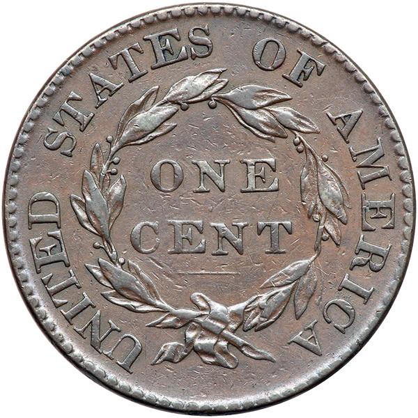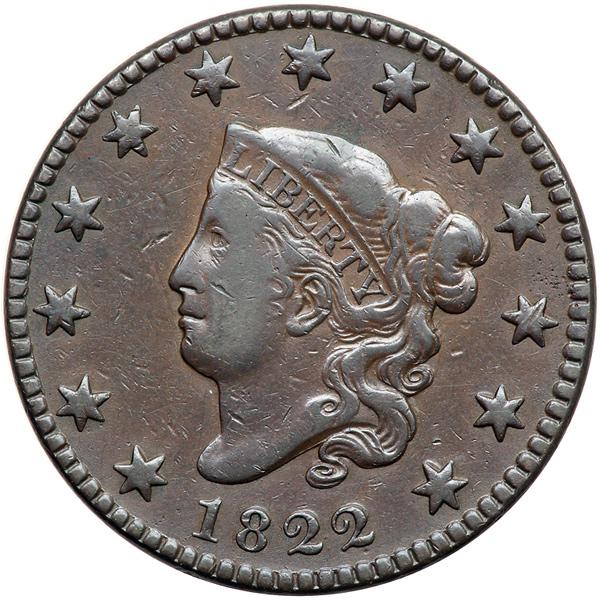 1822 N-7 R3+. Fine-15. Five points sharper but recolored an attractive glossy chocolate and steel with traces of frosty lighter brown in protected areas on the obverse. The only notable mark is a thin nick in the hair under star 7. MDS.