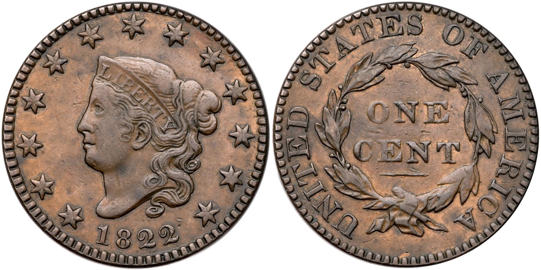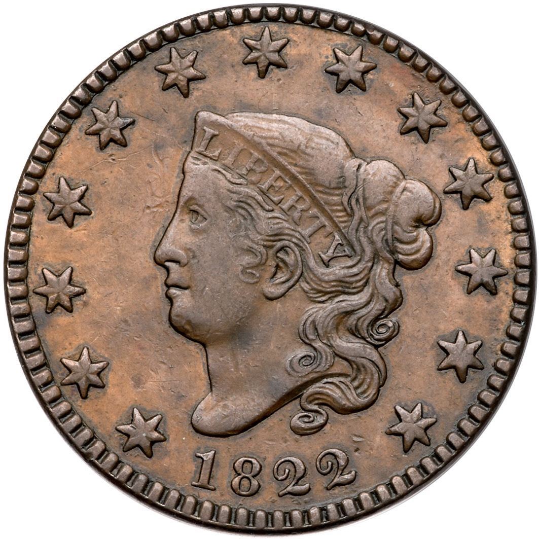 1822 N-8 R-4 VF30Glossy lighter brown in the fields, deeper steely chocolate on the devices. There is a thin mark under star 7, the only notable mark. M-LDS, with a clear bisecting die crack on the reverse through F in OF down to the wreath ribbon.Certificate Number: Pedigree: Ex; EAC Sale 2010:337 - Hugh Bodell