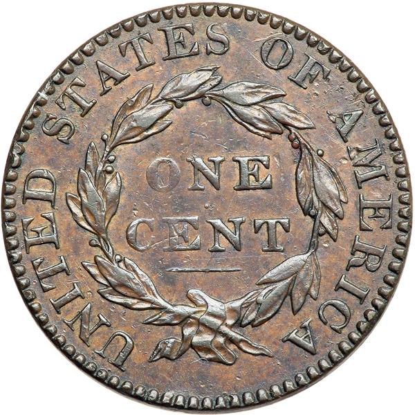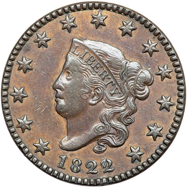 1822 N-8 R4 VF35. VF-35. At least five points sharper but there are too many tiny contact marks for the higher grade. None of these marks is distracting and the eye appeal remains excellent. The best identifying defects are a small spot of darker steel toning at the dentils over star 4 and a dull nick on the left foot of the M in AMERICA. Glossy chocolate brown with lots of frosty tan and light brown toning faded down from mint color in protected areas. M-LDS. The obverse die is uncracked but a faint crack extends through the tops of UNITED STATES OF AMER and a stronger nearly straight die crack reaches from the rim through the F in OF down to the left side of the ribbon. Minor crumbling shows at the dentils roots over the left side of the first T in STATES. The fields are smooth and prooflike on both sides, and this cent offers the eye appeal of a significantly higher grade. Called EF40 net VF30 and tied for CC#4 in the Noyes census, his photo #25436. Removed from an NGC slab graded AU58BN (NGC label included). DWH #2595.