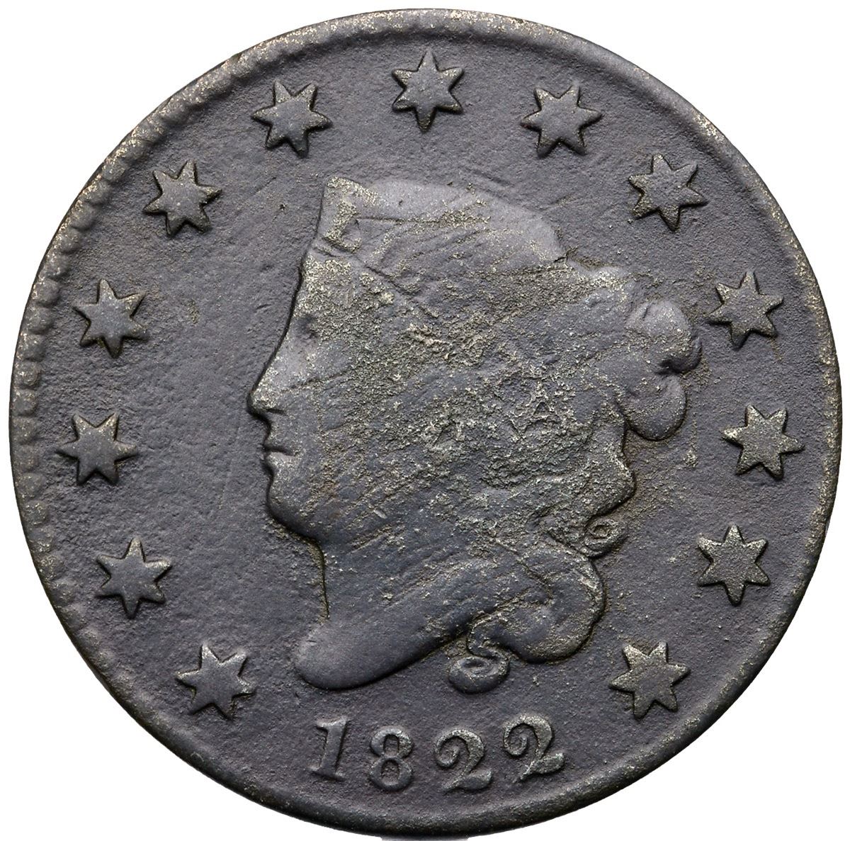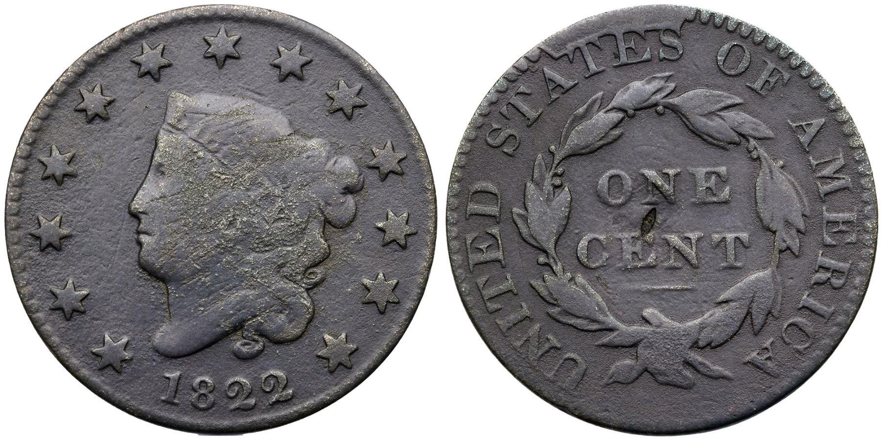 1822 N-9 R-5- G5A couple points sharper but covered with fine roughness, strongest on the portrait, and there is a dig at the top of E in CENT. No verdigris. Mostly matte and very dark steel. Rare LDS, with the strong raised retained cud break atop TES. Ex; Larry Whitlow - Myles Z. Gerson 10/1978 - John D. Wright 1/18/2006 - Bob Grellman & Chris McCawley 4/3/2006 - Dan Holmes Collection M&G Auctions/Goldbergs 5/2010:167 - Col. Steve Ellsworth - EAC Sale 2014 lot 217