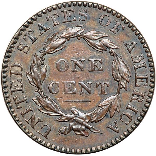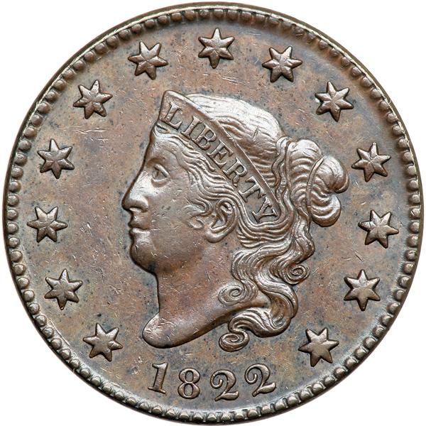 1822 N-9 R5- EF40. EF-40. Glossy steel brown and chocolate, the obverse delicately mottled with some darker steel brown tones. Traces of frosty mint luster show in protected areas. A tiny rim nick in the hair over ER and a thin, very light nick under the junction of C & E in CENT. EDS. The die cracks on the reverse are identical to those found on the latest state of the preceding N-8 marriage. The die crack through the top of TES is very faint and crumbling shows in the dentils over ST. The fields are smooth and slightly reflective on both sides thanks to a fresh die lapping prior to this marriage of two previously used dies (obverse for N-10, reverse for N-8). Tied for second finest known honors behind a marginally better example. DWH #2192.
