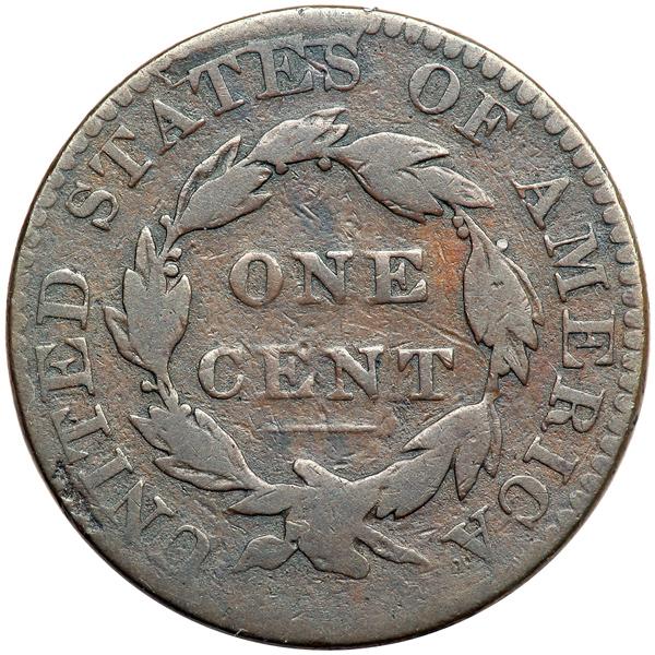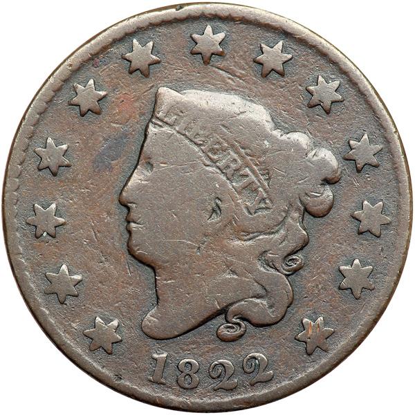 1822 N-9 R5- G6+. Good-6+. Rather glossy chocolate and medium brown with darker chocolate brown toning in protected areas. The only notable defect is a small patch of roughness on the rim over the I in UNITED. MDS with a strong die crack through the tops of TES to the dentils on either side. The section outside this crack is now a retained cud that has shifted outward slightly and is starting to sink, especially over the T. A decent lower-grade example, close to VG7. DWH #3137.