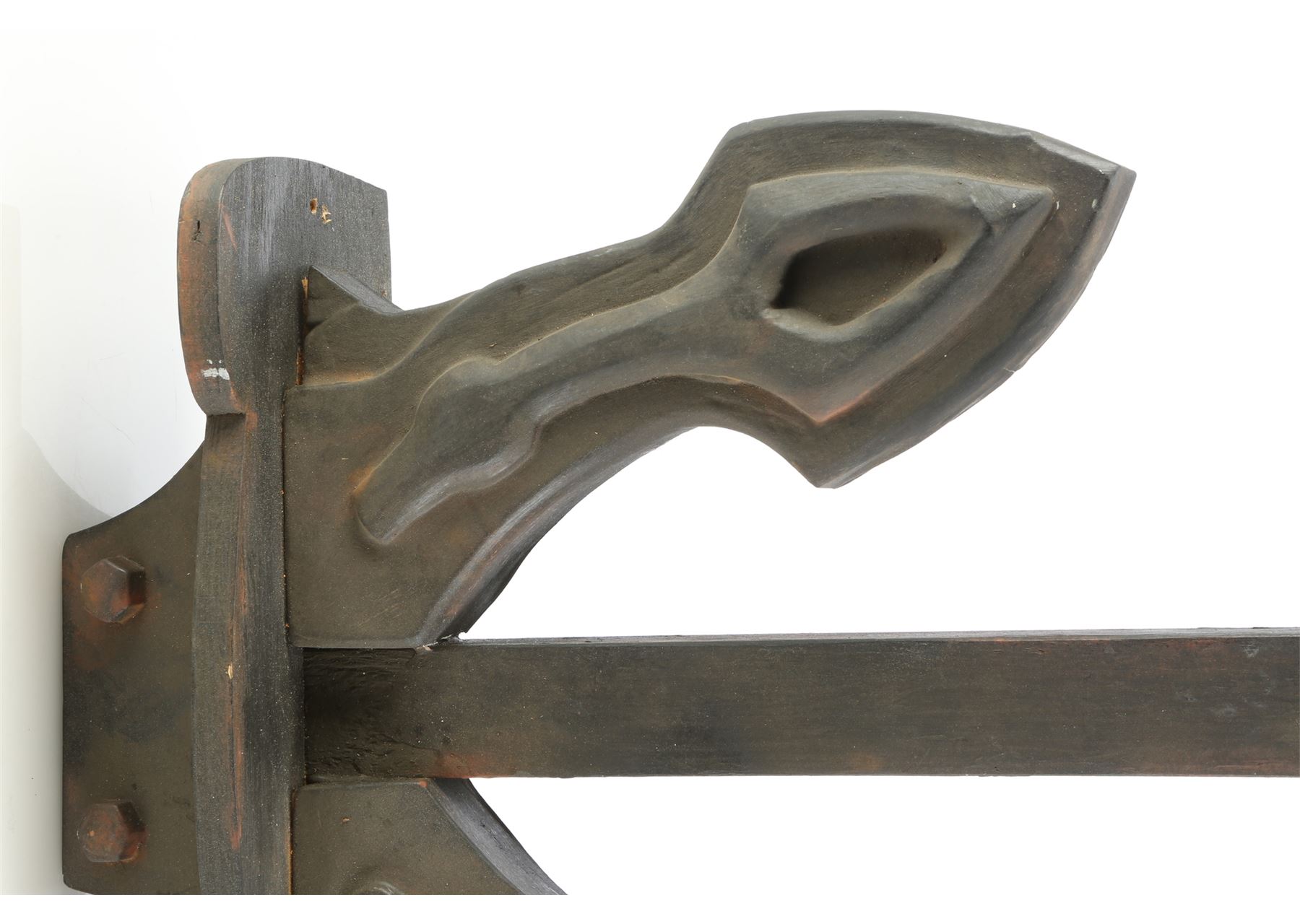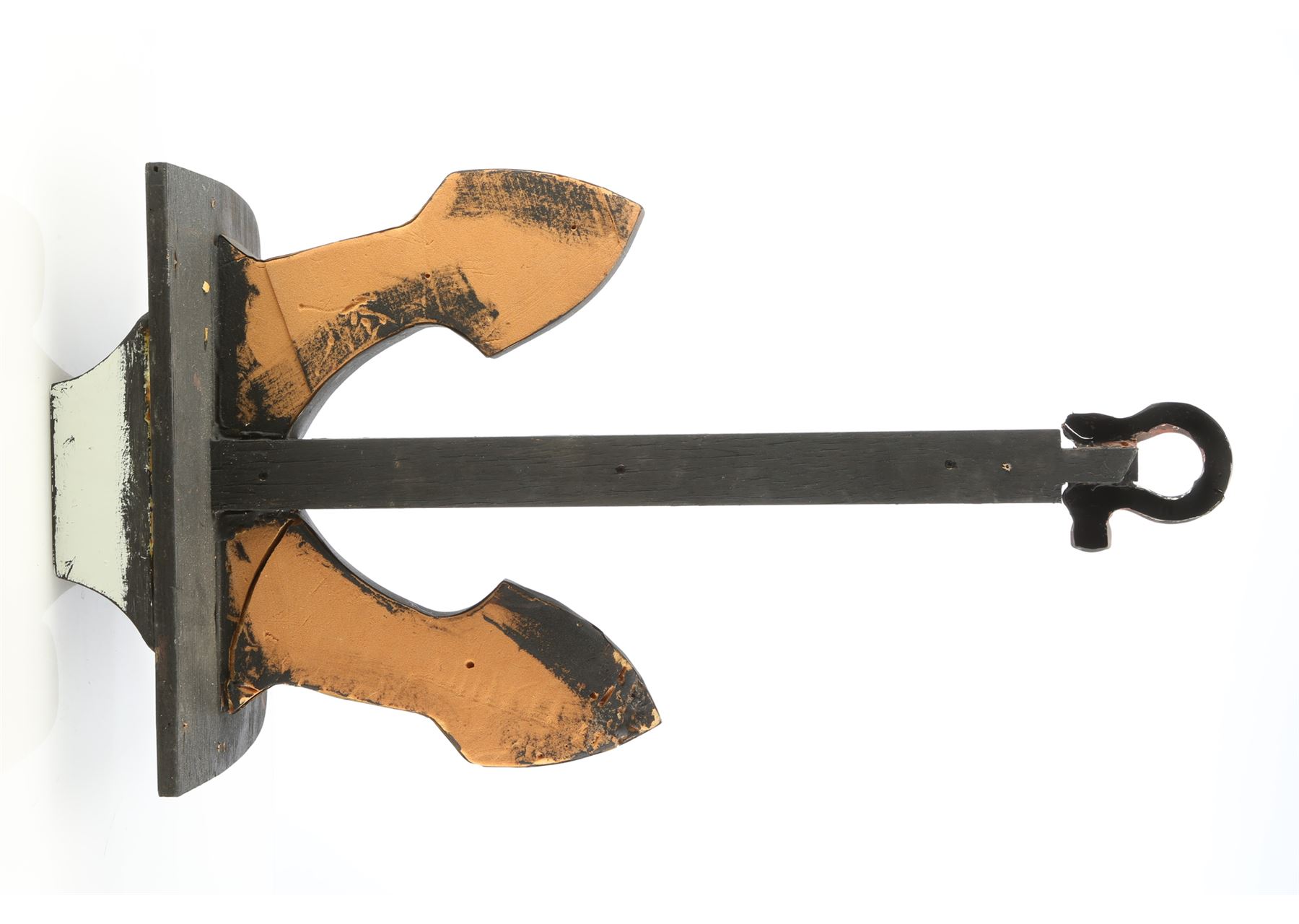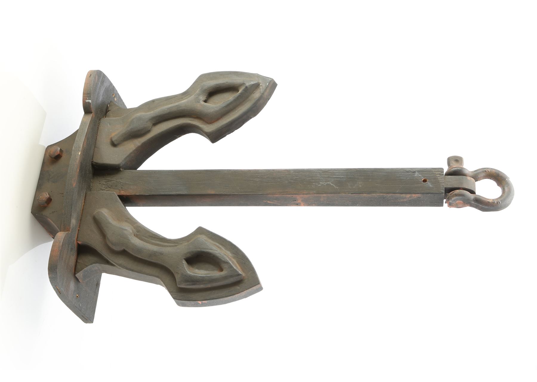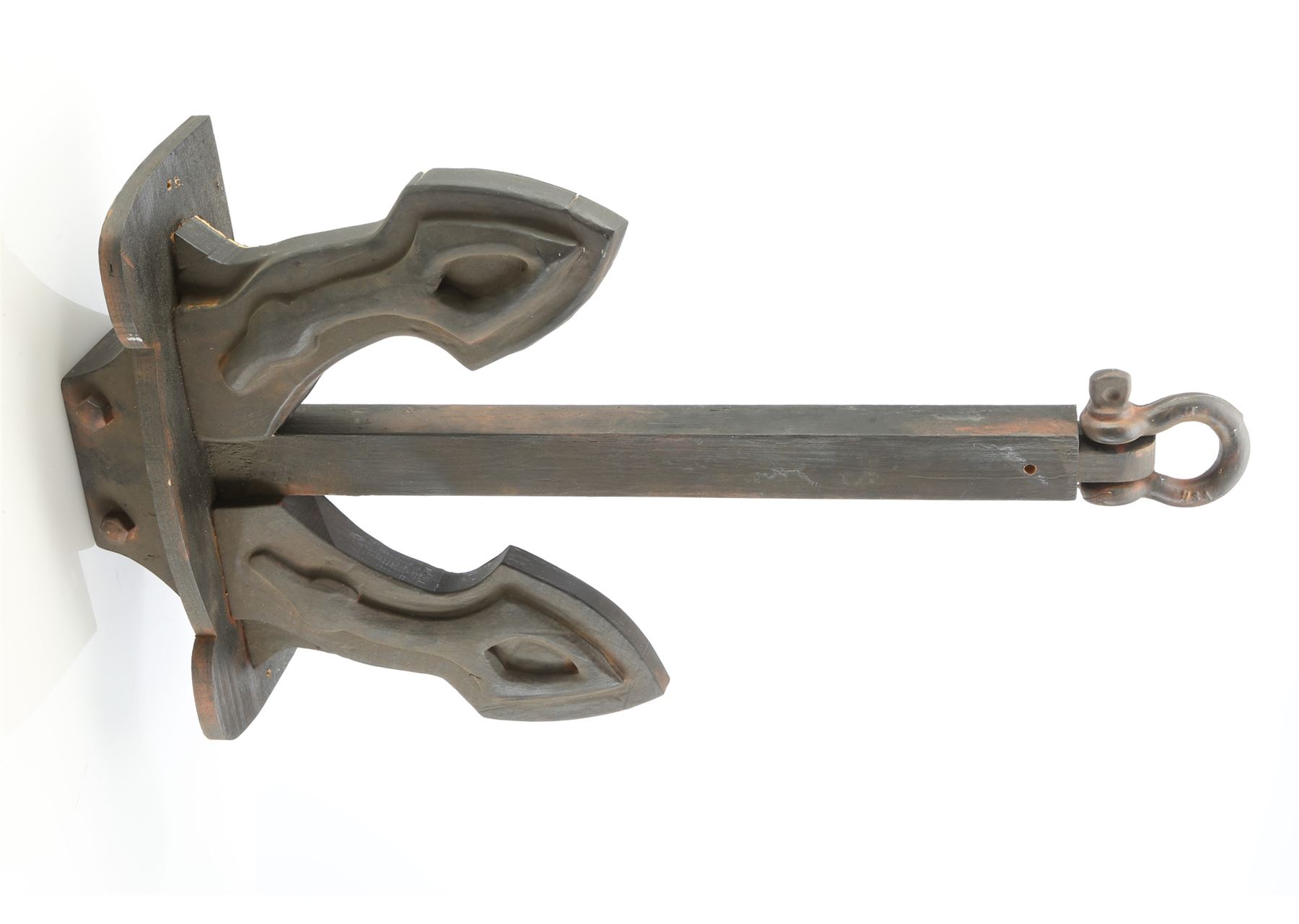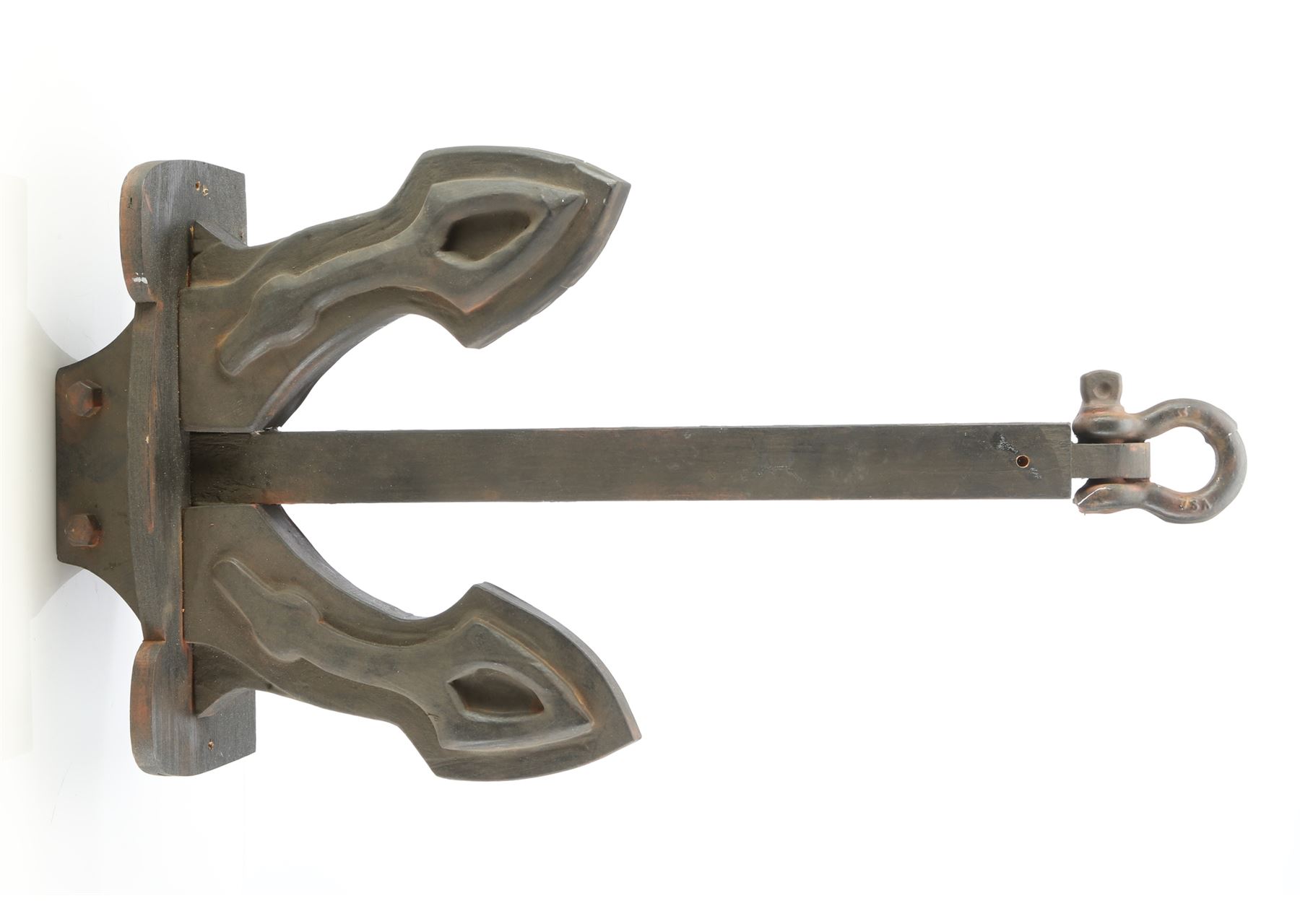 This resin, wood, and metal anchor is painted dark gray with small patches of dark orange and brown to resemble rusted metal. While its front face is fully painted, its reverse is largely unpainted. The anchor exhibits minor cracking and paint chipping throughout from production use. Dimensions: 37" x 19" x 7" (94 cm x 48.5 cm x 18 cm)