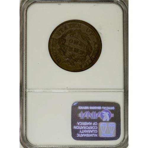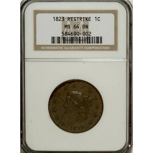 <B>1823 1C Restrike MS64 Brown NGC.</B></I> N-3, R.2. A chocolate-brown example with glimpses of mint red near the obverse rim. This a circa-1862 out-of-mint production struck from broken and rusted Mint dies discarded as scrap metal. The reverse die was formerly used to strike 1813-dated coins. Lightly hairlined, but moderately prooflike and attractive. EAC 60.<BR><BR><b>Shipping:</b> Coins & Currency (<a target="_blank" href="http://www.heritageauctions.com/common/shipping.php">view shipping information</a>)