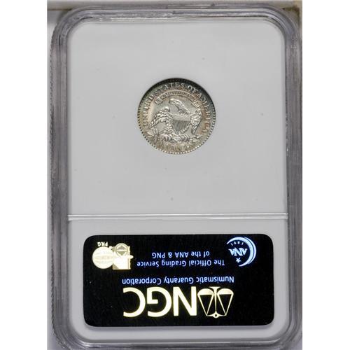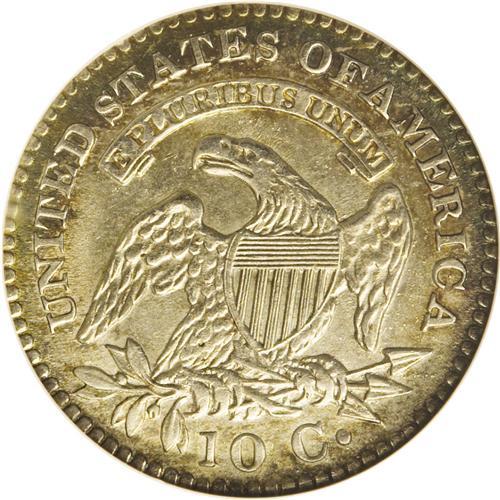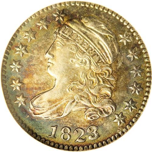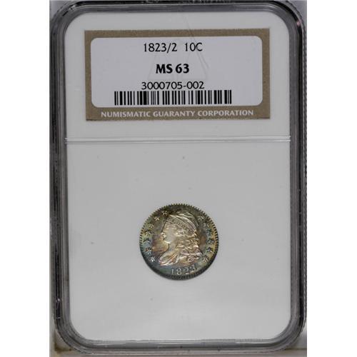 <B>1823/2<10C> Large Es MS63 NGC.</B></I> JR-3, R.2. Two obverse dies are known for 1823 dimes, and both are clearly overdated. This shimmering representative features lovely sea-green, plum, and golden-brown patina, although much of the portrait and reverse are untoned. The strike is crisp, and abrasions are absent.