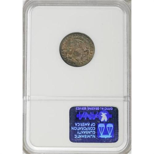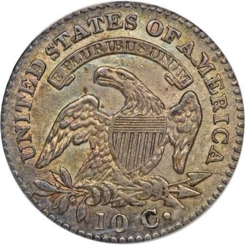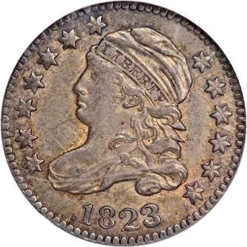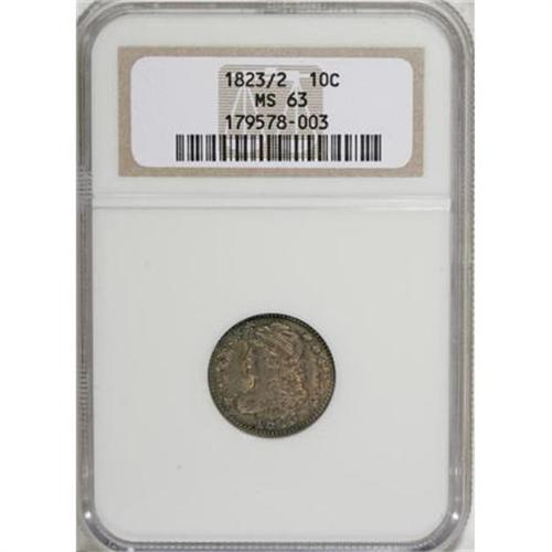 <B>1823/2 10C Large Es MS63 NGC.</B></I> JR-3, R.2. Almond-gold and rose-red toning graces the borders, while the portrait and open fields are gunmetal-gray. The 2 underdigit is obvious. The reverse legend apparently mixes dime and quarter letter punches, with the D, E, and M punches oversized relative to the other letters.<BR><BR><B>Coin Engraver:</B> John Reich<BR><BR><b>Shipping:</b> Coins & Currency (<a target="_blank" href="http://www.heritageauctions.com/common/shipping.php">view shipping information</a>)