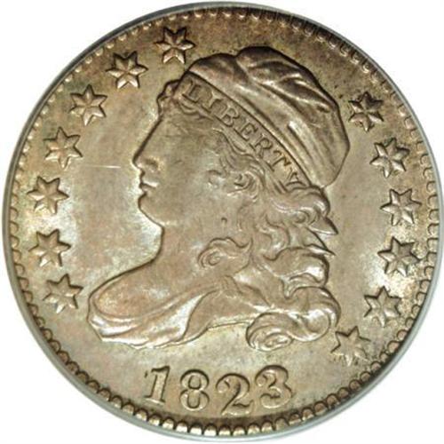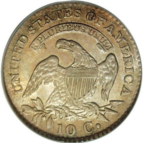 <B>1823/2 10C Large Es MS64 PCGS.</B></I> JR-3, R.2. The E in STATES is higher than either adjacent letter, and the top left star on the obverse points to the upper edge of the headband. The obverse of this well struck and shimmering dime has a rich layer of sapphire and green-gold patina, while the reverse offers peach, orange, and lavender toning. One of the finest representatives of this overdated issue. Population: 6 in 64, 1 finer (7/07).<BR><BR><B>Coin Engraver:</B> John Reich<BR><BR><b>Shipping:</b> Coins & Currency (<a target="_blank" href="http://www.heritageauctions.com/common/shipping.php">view shipping information</a>\)