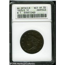<B>1823/2 1C --Scratched--ANACS. AU Details, Net VF35.</B></I> N-1, Low R.2. The deep golden-brown patina is consistent and attractive, and this piece exhibits little actual wear. A typically struck example with a pleasing obverse and a series of pinscratches on the reverse, these primarily affect CENT. An early die state that does not have a die break on the rim beneath the 8 in the date. Lot:5138