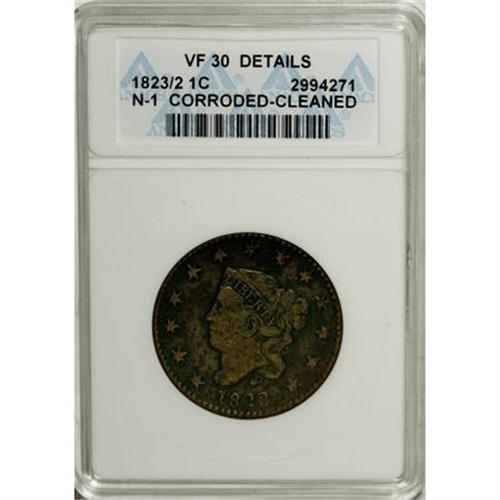 <B>1823/2 1C --Cleaned, Corroded--ANACS. VF 30 Details.</B></I> N-1. NGC Census: (5/19). PCGS Population (4/23). Mintage: 1,262,000. Numismedia Wsl. Price for NGC/PCGS coin in VF30: $1,110. (#1630)<BR><BR><B>Coin Engraver:</B> Robert Scot or John Reich<BR><BR><b>Shipping:</b> Coins & Currency (<a target="_blank" href="http://www.heritageauctions.com/common/shipping.php">view shipping information</a>)