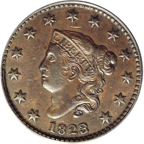 <B>1823/2<1C> XF45 PCGS.</B></I> N-1, Low R.2. A middle die state. The dentils between stars 2 and 3 are fused, but no die break is present beneath the date. The overdate is obvious on this suitably detailed example. Mostly medium brown, with an occasional hint of lighter tan toning. The reverse is lightly marked and has a few verdigris flecks near 3 o'clock. The obverse is typically abraded. EAC 30. Population: 6 in 45, 6 finer (4/06).