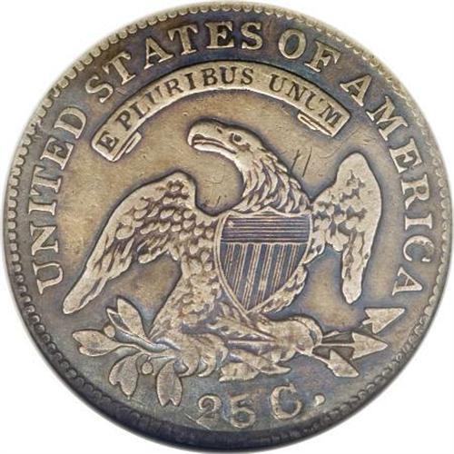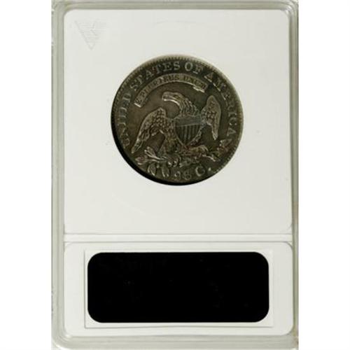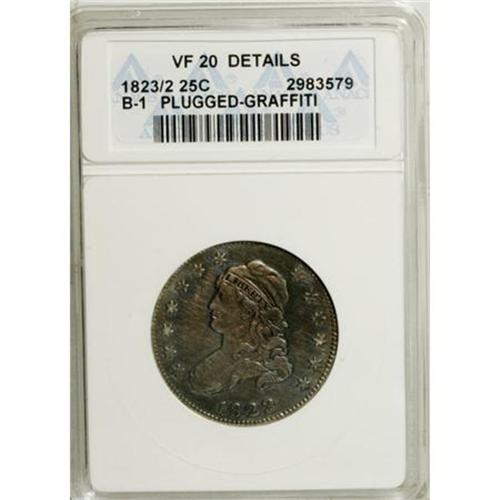 <B>1823/2 25C --Plugged, Graffiti--ANACS. VF20 Details.</B></I> B-1, R.6. Aside from the essentially uncollectible 1827, the 1823/2 is the unchallenged key date of the Capped Bust quarter series. The lowest arrowhead is missing its lower left corner, and the upper arrow shaft is broken. Both of these mint-made features are diagnostic for the rare 1823/2. This hairlined example is plugged and whizzed above Liberty's cap and opposite near the denomination. A light cursive L is noted on the field beneath the eagle's beak, and a pair of short vertical lines are entered near the right border of the eagle's neck. Deep ocean-blue toning embraces the borders, while the centers are light chestnut-gray. <BR><BR><b>Shipping:</b> Coins & Currency (<a target="_blank" href="http://www.heritageauctions.com/common/shipping.php">view shipping information</a>)