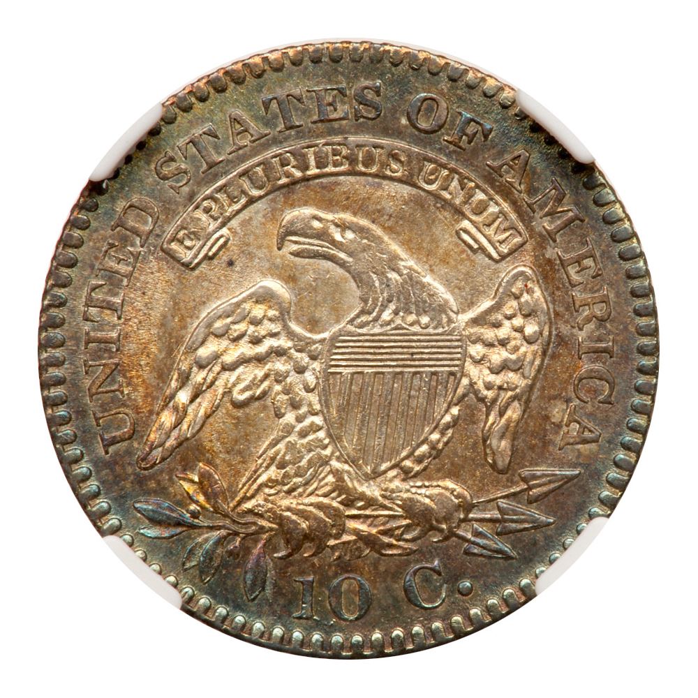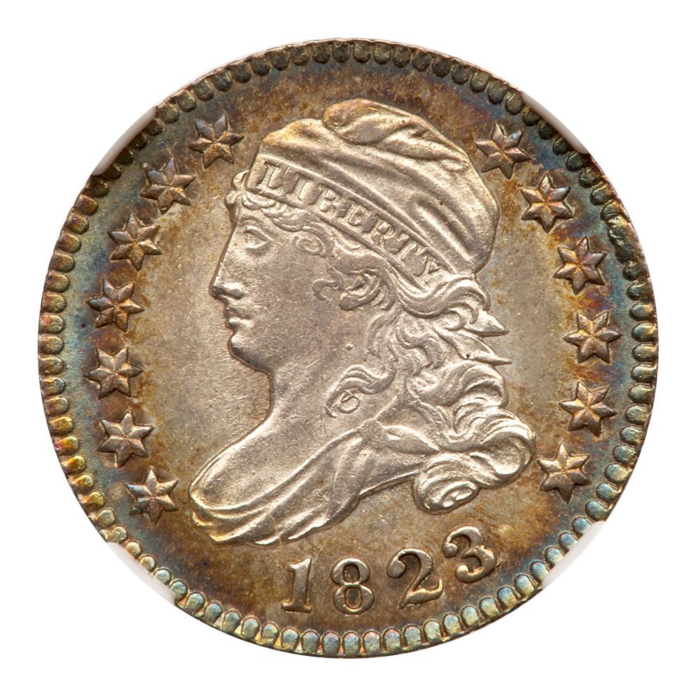 1823, 3 over 2. Small Es. JR-1, Rarity 3. NGC graded MS-65. Lovely blue toning around the edges of both sides, which lightens to russet and gold in the fields and over the devices. The strike is fairly sharp, with just a hint of softness on the curl over Libertys ear. Mint freish luster is evident throughout. A condition rarity at this lofty level, and a coin of considerable eye appeal. Pop 6; 3 finer, 2 in 66, 1 in 66+ Star. Estimated Value 10,000 - UP