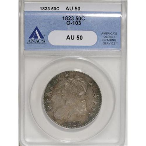 <B>1823 50C ( ) AU50 ANACS.</B></I> O-103. NGC Census: (33/420). PCGS Population (58/333). Mintage: 1,694,200. Numismedia Wsl. Price for NGC/PCGS coin in AU50: $425. (#6131)<BR><BR><B>Coin Engraver:</B> John Reich<BR><BR><b>Shipping:</b> Coins & Currency (<a target="_blank" href="http://www.heritageauctions.com/common/shipping.php">view shipping information</a>)