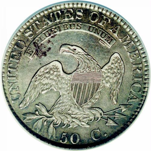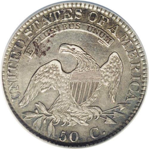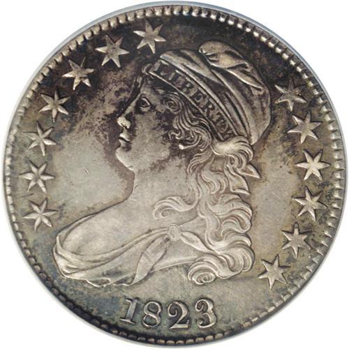 <B>1823<50C>--Environmental Damage--NCS. AU Details.</B></I> O-106a, R.2. Overton describes this die state of the O-106 marriage as having a reworked 3 in the date and a die crack connecting stars 11 through 13 with the hair curl. The present example has the obviously reworked 3 in the date, but it completely lacks the die crack. After conservation this coin has smoky-gray surfaces, with some slight planchet damage noticeable mostly under a glass. The strike is better than might be expected, however, and the coin retains considerable eye appeal.<BR><I>Ex: Werl (7/29/1985).</B></I> Envelope Included.