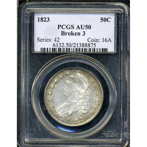 <B>1823 50C AU50 PCGS.</B></I> O-110, R.2. Incorrectly described by PCGS as a Broken 3 variety. PCGS Population (56/310). NGC Census: (32/410). Mintage: 1,694,200. Numismedia Wsl. Price: $367. (#6131)<BR><BR><b>Shipping:</b> Coins & Currency (<a target="_blank" href="http://www.heritageauctions.com/common/shipping.php">view shipping information</a>)