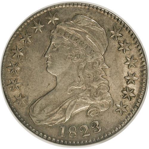 <B>1823 50C AU55 NGC.</B></I> O-105. NGC Census: (130/628). PCGS Population (64/228). Mintage: 1,694,200. Numismedia Wsl. Price for NGC/PCGS coin in AU55: $600. (#6131)<BR><BR><b>Shipping:</b> Coins & Currency (<a target="_blank" href="http://www.heritageauctions.com/common/shipping.php">view shipping information</a>)