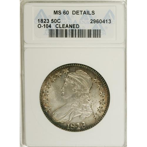 <B>1823 50C --Cleaned--ANACS. MS60 Details.</B></I> O-104. NGC Census: (3/164). PCGS Population (4/158). Mintage: 1,694,200. Numismedia Wsl. Price: $725. (#6131)<BR><BR><b>Shipping:</b> Coins & Currency (<a target="_blank" href="http://www.heritageauctions.com/common/shipping.php">view shipping information</a>)