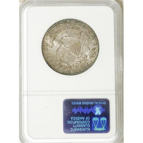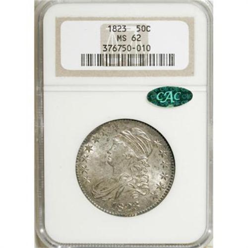 <B>1823 50C MS62 NGC. CAC.</B></I> O-107, R.2. Dappled olive and stone-gray toning embraces this lustrous and lightly abraded Capped Bust half. Sharply struck save for the upper left stars.<BR><I>From The Southwest Collection.</B></I><BR><BR><B>Coin Engraver:</B> John Reich<BR><BR><b>Shipping:</b> Coins & Currency (<a target="_blank" href="http://www.heritageauctions.com/common/shipping.php">view shipping information</a>)