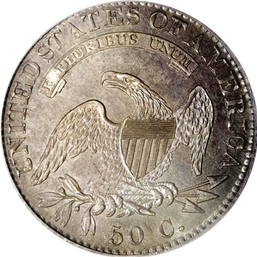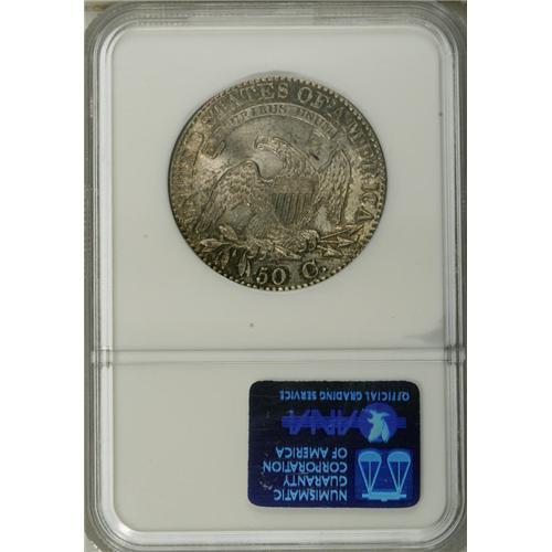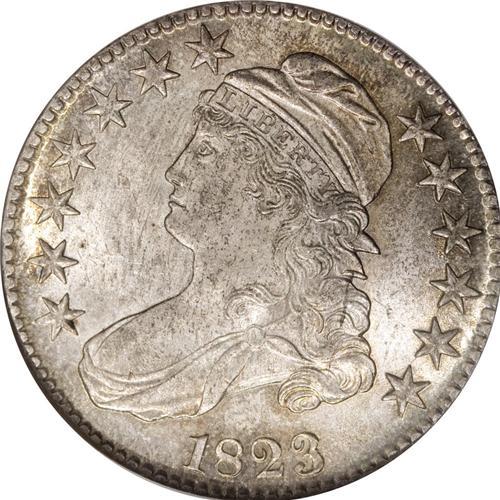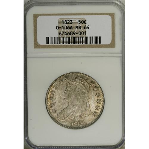 <B>1823 50C MS64 NGC.</B></I> O-106a, R.2. This later die state is slightly more plentiful than the early die state. Overton wrote: "Although in this variety the three is a bit rough and irregular, it is not any of the varieties known as the broken, patched, or ugly 3s." Despite his comment, examples of this die variety and die state are occasionally offered as Patched 3 pieces. A frosty Mint State coin, this piece has pleasing ivory luster with splashes of mottled olive-gold toning, slightly more evident near the borders. The strike is well centered and the denticles are fully formed, although we note that most of the stars lack centrils and are beginning to draw toward the rims. The central devices, in contrast, are smartly impressed with even the uppermost hair curl and the eagle's talons rising boldly above their backdrops. The diagnostic die crack that joins stars 11, 12, and 13 to the lowest curl is readily evident, and we report no post-production impairments.<BR><I>Ex: Heritage (1999 ANA Sale), lot 7045.</B></I><BR><I>From The Westmoreland, Virginia Collection, Part Two.</B></I><BR><BR><b>Shipping:</b> Coin/Currency (<a target="_blank" href="http://www.heritageauctions.com/common/shipping.php">view shipping information</a>)