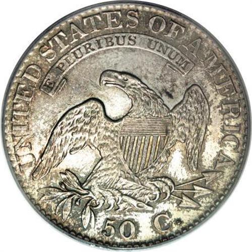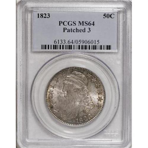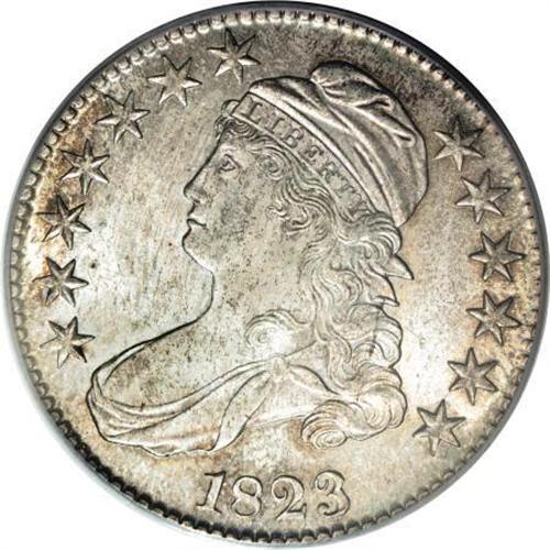 <B>1823 50C MS64 PCGS.</B></I> O-106a, R.2. PCGS has incorrectly designated this example as a Patched 3 variety, which is O-101a and O-102. Per Overton, "although in this variety the three is a bit rough and irregular, it is not any of the varieties known as the broken, patched or ugly 3." O-106a may lack a catchy nickname, but the present representative is a splendid near-Gem. Autumn-gold and cream-gray blend throughout the lustrous surfaces. Well struck except for a few star centers, and impeccably preserved with only minor contact beneath the left scroll end.<BR><BR><B>Coin Engraver:</B> John Reich<BR><BR><b>Shipping:</b> Coins & Currency (<a target="_blank" href="http://www.heritageauctions.com/common/shipping.php">view shipping information</a>)