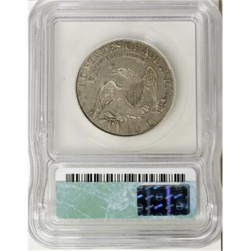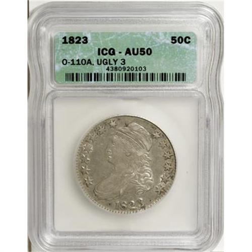 <B>1823 50C Ugly 3 AU50 ICG.</B></I> O-110a, R.3. A popular Guide Book variety often confused with the similar Patched 3 (O-101a and O-102). This gunmetal-gray piece retains significant luminous pale gold luster. Marks are noted on each side of star 9.<BR><BR><B>Coin Engraver:</B> John Reich<BR><BR><b>Shipping:</b> Coins & Currency (<a target="_blank" href="http://www.heritageauctions.com/common/shipping.php">view shipping information</a>)