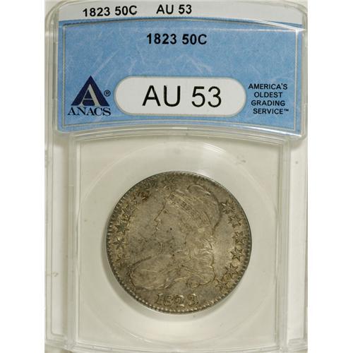 <B>1823 50C Ugly 3 AU53 ANACS.</B></I> O-110a, R.3. Softly lustrous beneath soothing gold, blue, and gray patina. Well struck with light but distinct wear on the hair below the Y in LIBERTY.<BR><I>From The Reginald Byron Mason Collection.</B></I><BR><BR><b>Shipping:</b> Coins & Currency (<a target="_blank" href="http://www.heritageauctions.com/common/shipping.php">view shipping information</a>)
