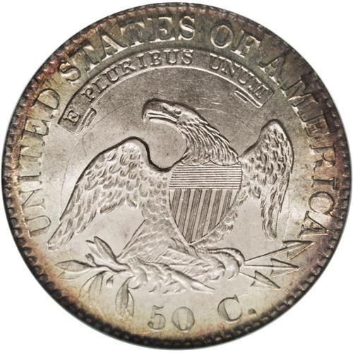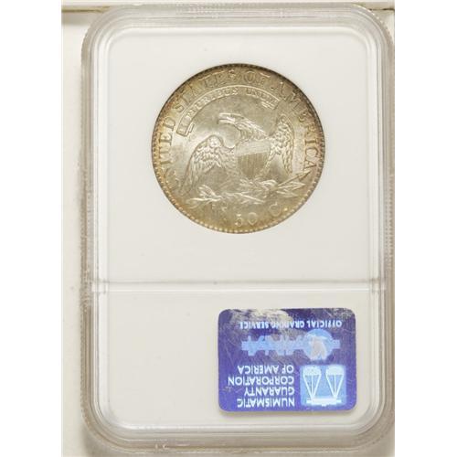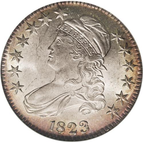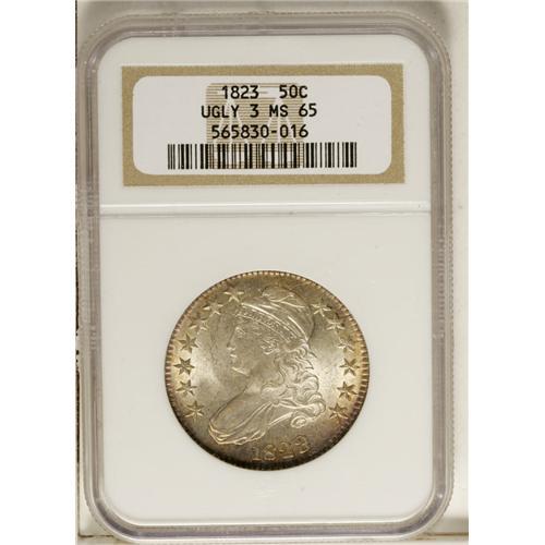 <B>1823 50C Ugly 3 MS65 NGC.</B></I> O-110a, R.3. Called "Ugly 3 variety" because of the mint repair on the middle of the 3 in the date. A reverse die crack runs through the olive leaves, enters the lower part of the eagle's right (left facing) wing, and exits above before fading out. A second crack runs down from the eagle's left wing through the arrowheads and 50 C before it terminates at the rim. This Gem example displays bright luster and delicate lavender and gold-tan peripheral toning. Well centered design elements are crisply impressed, save for the star centers at the upper left border. A couple of minor obverse handling marks do not distract. Overall, a very pleasing Capped Bust half dollar.<BR><BR><b>Shipping:</b> Coin/Currency (<a target="_blank" href="http://www.heritageauctions.com/common/shipping.php">view shipping information</a>)