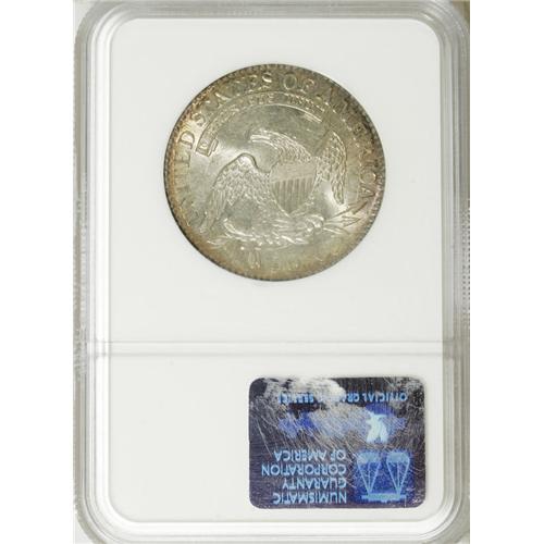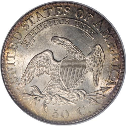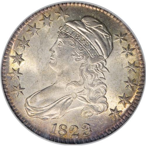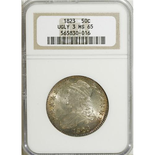 <B>1823 50C Ugly 3 MS65 NGC.</B></I> O-110a, R.3. Called the "Ugly 3 variety" because of the mint repair on the middle of the 3 in the date. A reverse die crack runs through the olive leaves, enters the lower part of the eagle's right (left facing) wing, and exits above before fading out. A second crack runs down from the eagle's left wing through the arrowheads and 50 C before it terminates at the rim. This Gem example displays bright luster and delicate lavender and gold-tan peripheral toning. Well centered design elements are crisply impressed, save for the star centers at the upper left border. A couple of minor obverse handling marks do not distract. Overall, a very pleasing Capped Bust half dollar.<BR><BR><b>Shipping:</b> Coins & Currency (<a target="_blank" href="http://www.heritageauctions.com/common/shipping.php">view shipping information</a>)