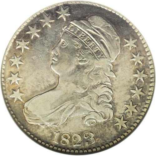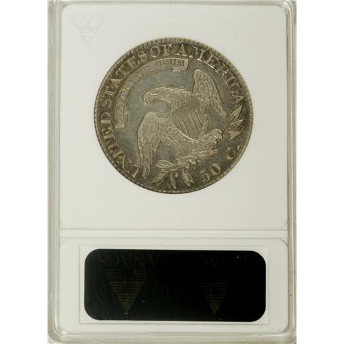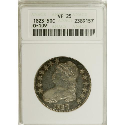<B>1823 50C VF25 ANACS.</B></I> O-109, R.5. This obverse was used on three varieties, and is differentiated by the advanced state of the die cracks (this variety has the most heavily cracked obverse). Reverse H, however, is only found on this variety. While certainly not a Condition Census coin, it is interesting to note that many of the lower and mid-grade examples that have been sold of this variety have pinscratches or other obvious surface flaws. This piece has bright surfaces that are mostly brilliant in the centers and ringed with light golden-brown color around the margins.<BR><BR><b>Shipping:</b> Coins & Currency (<a target="_blank" href="http://www.heritageauctions.com/common/shipping.php">view shipping information</a>)