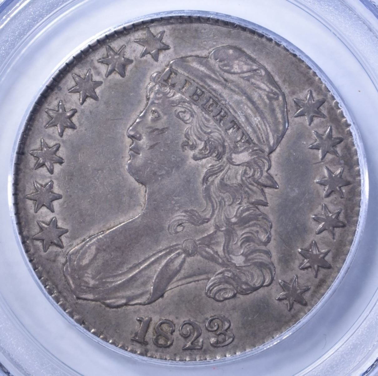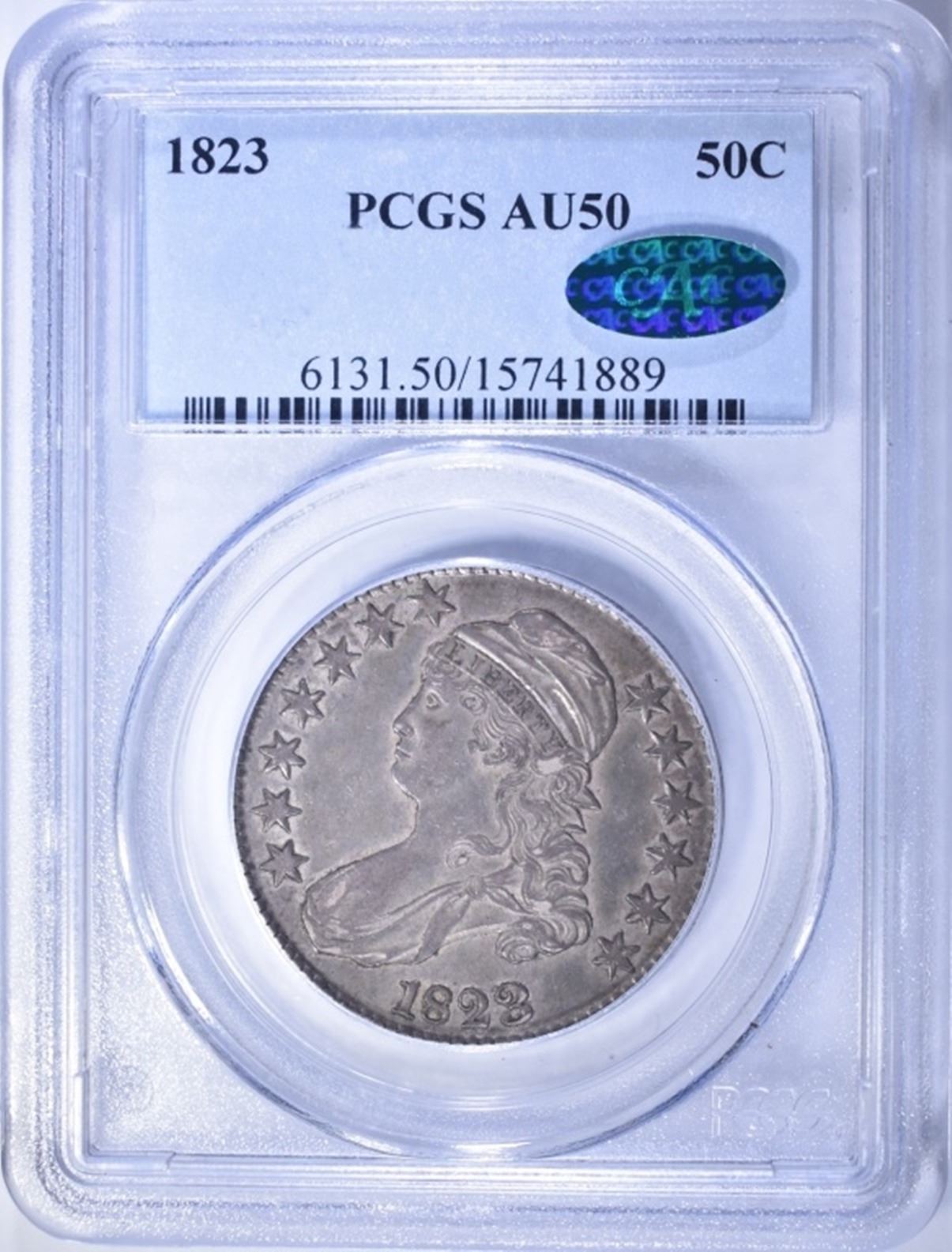 1823 BUST HALF DOLLAR, PCGS AU-50 CAC STICKER