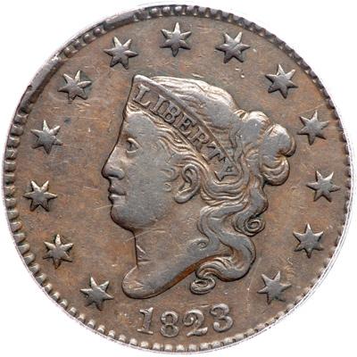 1823 N-2 R2. PCGS graded VF-30. Glossy light olive and chocolate brown with steel brown toning on the highpoints. No roughness or verdigris, only tiny contact marks of no significance. A small nick on the front edge of the neck and a tiny scuff close over star 13 are good identifying marks. MDS with clear rim breaks left of star 5 and over star 6. An attractive mid-grade example of this tough date. Our grade is VF25.