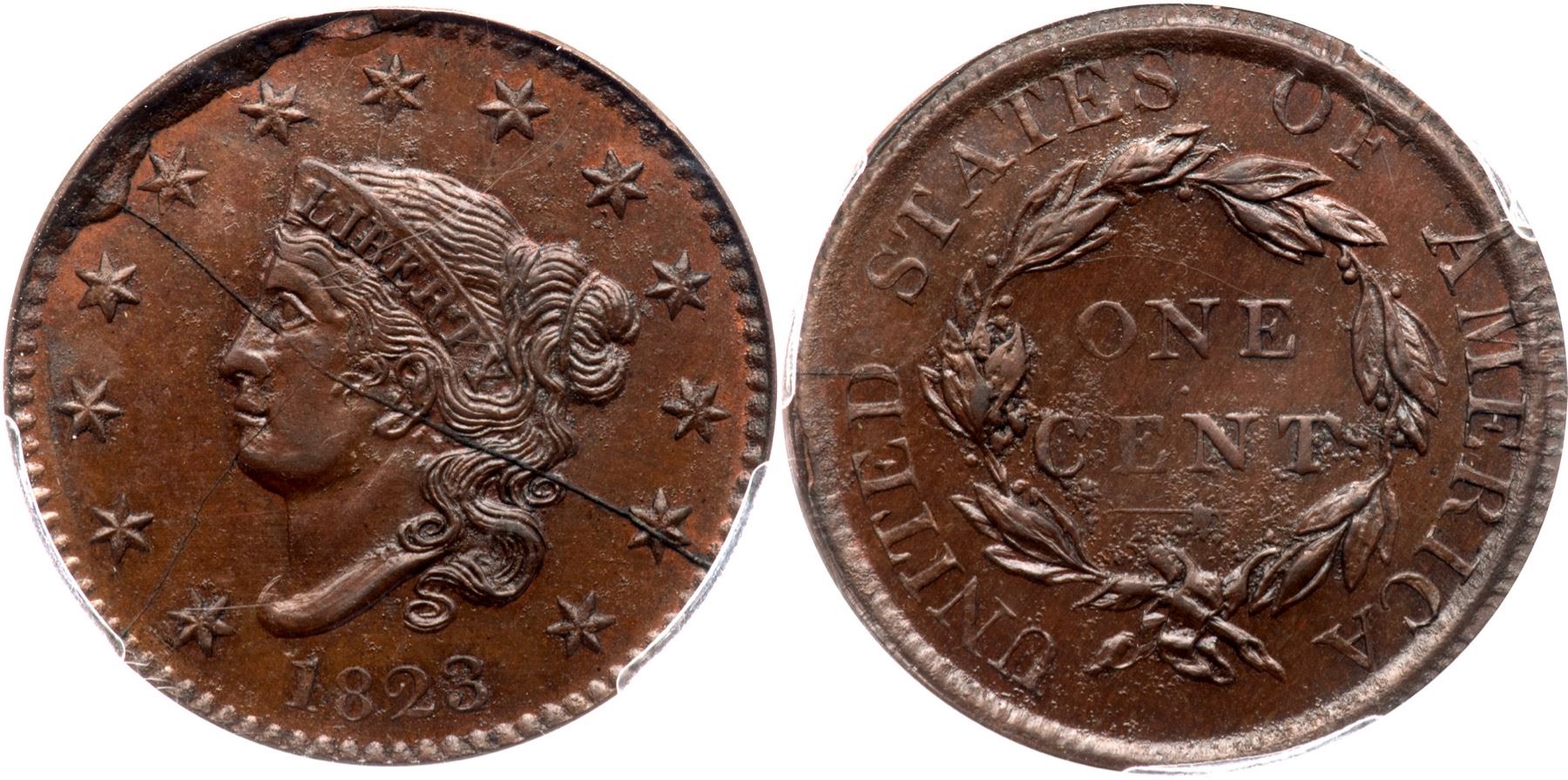Glossy medium brown with a trace of mint red. Mark free M-LDS but not the latest. The crack from TE in STATES to the wreath has not yet formed.
