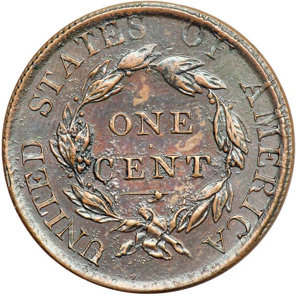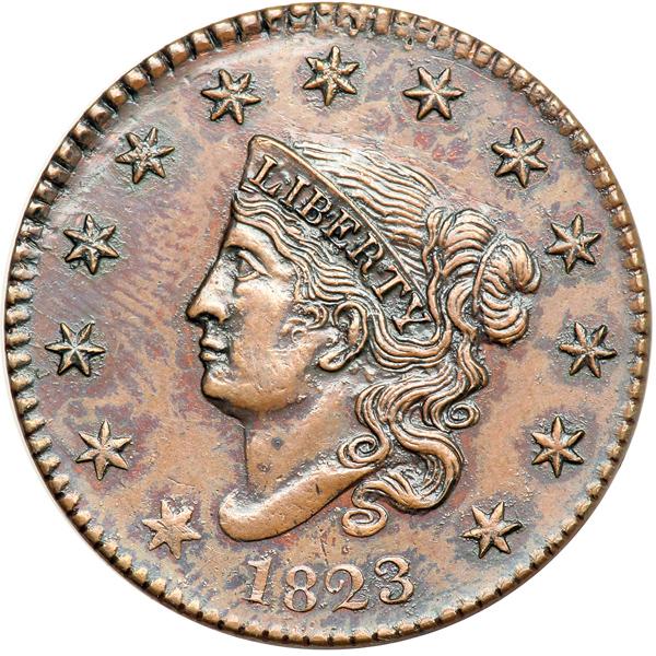 1823 Restrike EF45. EF-45. Sharper but lightly cleaned, now retoned glossy chocolate brown with lighter brown highpoints. Coated with a very thin layer of lacquer or some similar protectant. A thin, very light nick over the left top of the 2 in the date is the best identifying mark. Early die state, before any die cracks. The cud breaks at stars 4-6 were skillfully removed and the dentils added back in that area in an attempt to make this piece pass as an original 1823 cent. Removing the cud and adding the dentils appears to have been done to many if not most of the pieces struck before the obverse die cracked. Breen says 49 uncracked examples were struck in 1862 for Joseph J. Mickley. Noyes photo #39633. Weight 160.1 grains. DWH #0568.