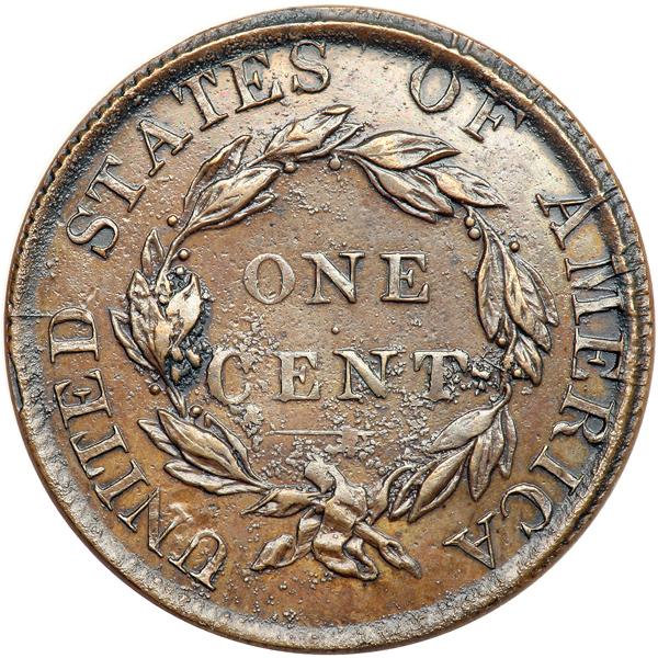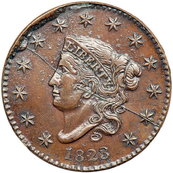 1823 Restrike EF45. EF-45. Glossy medium brown and chocolate. Covered with a very thin layer of lacquer (which could be removed rather easily, if desired). Excellent eye appeal for the grade, free of any spots or marks. MDS with the earlier bisecting obverse crack plus a crack from the rim to the top of D in UNITED, but without the additional crack from the bottom of that D to the leaf below the adjacent S. The reverse is rotated 30 degrees CCW. According to Breen, this die state was struck beginning in 1879. Noyes photo #39632. Weight 161.6 grains. DWH #0569.