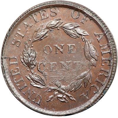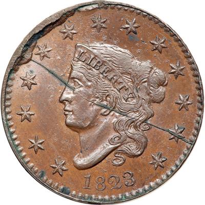 1823 Restrike. MS-60 Plus. Glossy light chocolate brown with frosty lighter steel brown in protected areas. Two small spots of very fine carbon at the dentils near star 1 and a tiny splash of dark toning under star 8 are the only marks on otherwise choice surfaces. M-LDS. The bisecting obverse die crack is strong and the reverse crack from the rim to the D extends weakly to the wreath. Struck privately outside the mint using discarded official mint dies sometime in the 1870's. The obverse die is from the 1823 Newcomb-2 but the reverse from 1813 Sheldon-293.