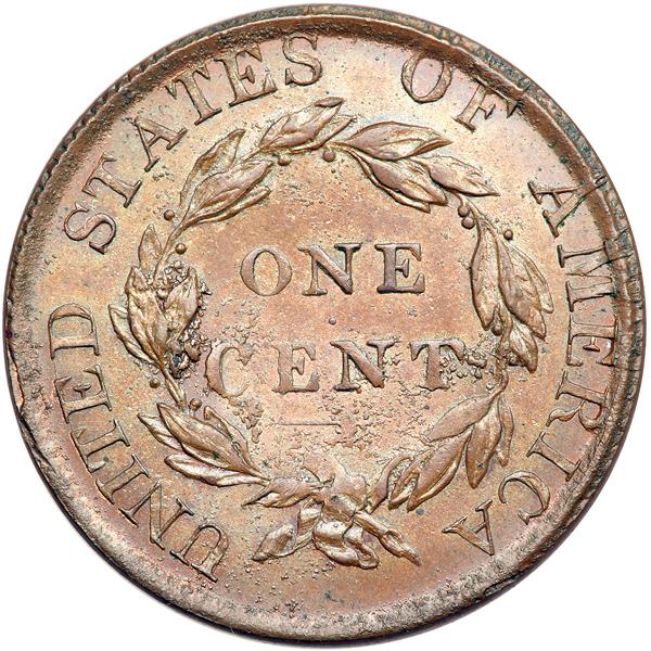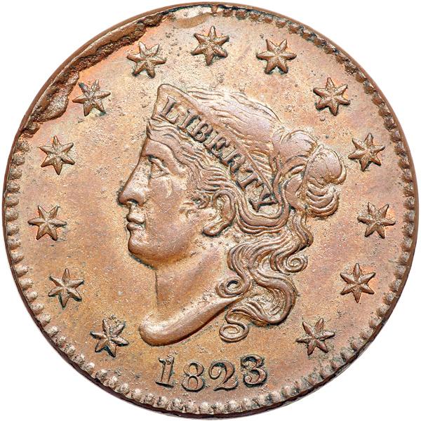1823 Restrike MS60. PCGS graded MS-63 Brown. Glossy light to medium brown with traces of faded original red in protected areas. A shallow planchet flake under the right corner of the eye is the only notable defect, as struck. EDS, before the obverse die cracked. The fields are slightly reflective thanks to the extensive lapping required to minimize the die rust that occurred during decades of improper storage. The rim cud breaks seen on the latest state of 1823 N-2 are present, although they are stronger than those seen on the latest state of the genuine mint product. A very attractive example of this rare die state. Made outside the mint using discarded mint dies sold as scrap. The obverse die used was the normal Newcomb-2 variety of 1823, but apparently a reverse die of the type used in 1823 was not available and they substituted a reverse die used for the 1813 Sheldon-293 variety. The result was an "1823" cent that looked nothing like the genuine mint product. Breen says 49 uncracked examples were struck in 1862 for Joseph J. Mickley before the obverse die broke. Noyes photo #39634. Weight 160.7 grains. Our grade is MS60. Pop 3; 14 finer in Brown at PCGS. DWH #1835 (PCGS # 81627) .
