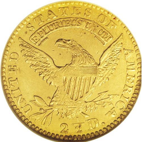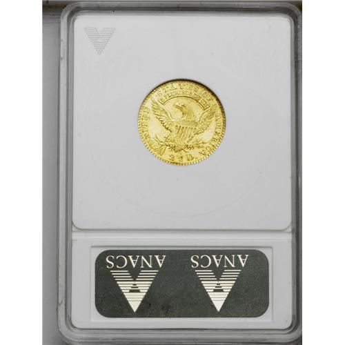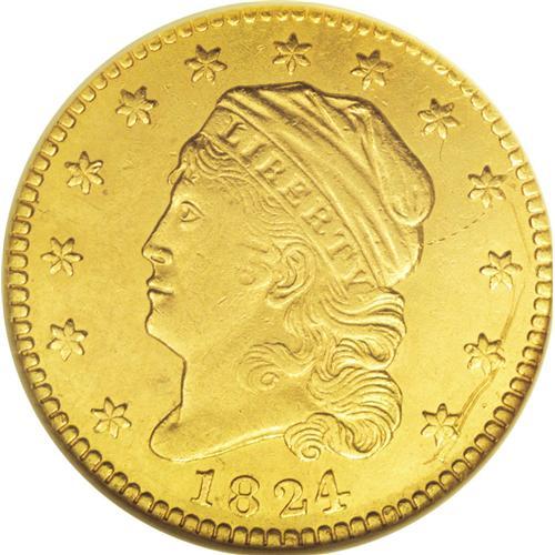 <B>1824/1<$2 1/2>--Scratched, Cleaned--ANACS. AU Details, Net XF40.</B></I> Bass-3019, Breen-6127, R.4, the only die pairing for the year. Several notable scratches are seen in the right obverse field surrounding stars 10 to 13 and behind Liberty's head. The surfaces are unnaturally bright from having been cleaned at one time. Still, this is an important and pleasing circulated survivor of this, the second lowest mintage (2,600 pieces) issue in the Capped Head Left quarter eagle series. About 20 degrees of clockwise die rotation is noted. Surprisingly, the 1824/1 is the second most available date of its type in today's market.<BR><I>From The Chief Paduke Collection.</B></I>