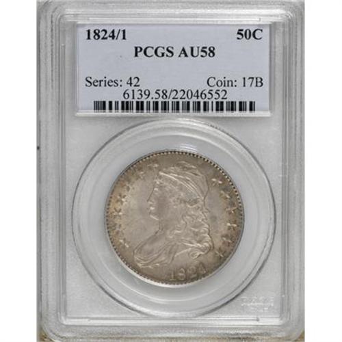 <B>1824/1 50C AU58 PCGS.</B></I> O-101, R.2. A pleasing near-Mint example from this Mint-economy issue, well-defined with warm golden-tan and violet peripheral toning around slate-gray centers. Interesting and desirable. Population: 4 in 58, 21 finer (12/07).<BR><BR><B>Coin Engraver:</B> John Reich<BR><BR><b>Shipping:</b> Coins & Currency (<a target="_blank" href="http://www.heritageauctions.com/common/shipping.php">view shipping information</a>)