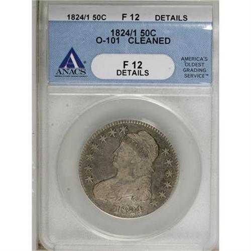 <B>1824/1 50C --Cleaned--ANACS. F12 Details.</B></I> O-101. NGC Census: (0/0). PCGS Population (0/48). (#6139)<BR><BR><B>Coin Engraver:</B> John Reich<BR><BR><b>Shipping:</b> Coins & Currency (<a target="_blank" href="http://www.heritageauctions.com/common/shipping.php">view shipping information</a>)