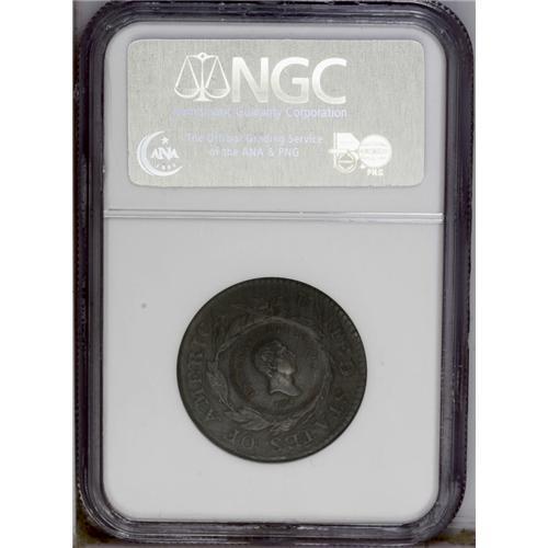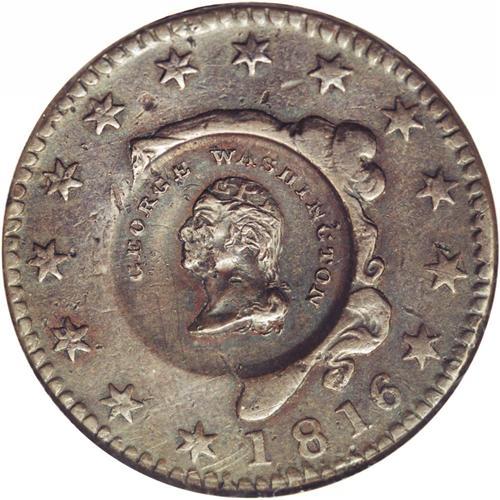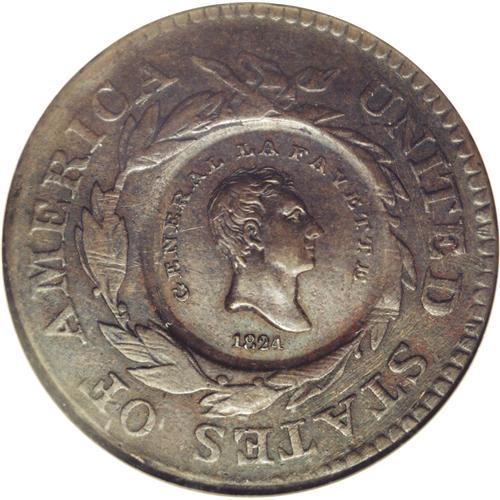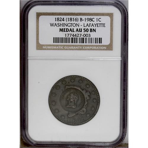 <B>1824 (1816) Large Cent With Washington-Lafayette Counterstamp AU50 NGC.</B></I> Baker-198C. Brunk L-46. Enlisting in the French army at the age of 14, Lafayette rose to captain in 1776. He served with distinction at the battles of Brandywine, Monmouth, and Yorktown. He visited the United States again in 1824 amid great pomp and ceremony. Counterstamped coins, such as this one, were made by Joseph Lewis. They were allegedly thrown from carriages in the general's procession to the crowds that lined the streets of the towns through which the general passed. Examples are known on large cents of various dates, an 1824 dime, two half dollars, a one real, and a two reales piece. Small medals of this same design are also known in gold, silver, and white metal.<BR> It has been several years since we have offered one of these historic medals at auction. This piece shows good detail on the counterstamps. However, there are numerous small abrasions at the forefront of Washington's portrait, several tiny digs in the left field of the counterstamp, and a couple of pinscratches in the same area. The host coin has VF details with a few shallow pinscratches through UNITED STATES. Deep, even brown patina.